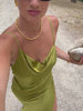 Introducing Odessa, a gown designed for an unforgettable evening affair. Crafted in bold pistachio green viscose, Odessa is cut on the bias to drape effortlessly over the feminine form. Subtle tucks at the side hip add a touch of structure and harmony. Odessa's delicate spaghetti straps and soft cowl neckline beautifully balance a daring thigh-high slit. Tailored to captivate, Odessa is complete with an asymmetrical deep V back, finely finished with artistic cascading satin details.