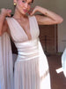 The gown opens with a plunging v-neckline, beautifully gathered at the bust to create soft, flattering draping that frames the décolletage. A defining stretch taffeta waistband cinches the silhouette, elongating the frame before releasing into an elegantly sheer skirt that flows to the floor. At the back, a low squared cut reveals just enough skin, while adjustable straps descend into long cascade sashes, adding an element of graceful movement and romantic detail.The invisible side zip ensures a seamless finish, allowing the gown to drape naturally without interruption. Ramona is the epitome of timeless elegance. Refined yet relaxed, perfect for those who seek sophistication without effort.